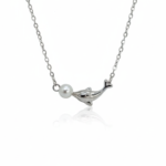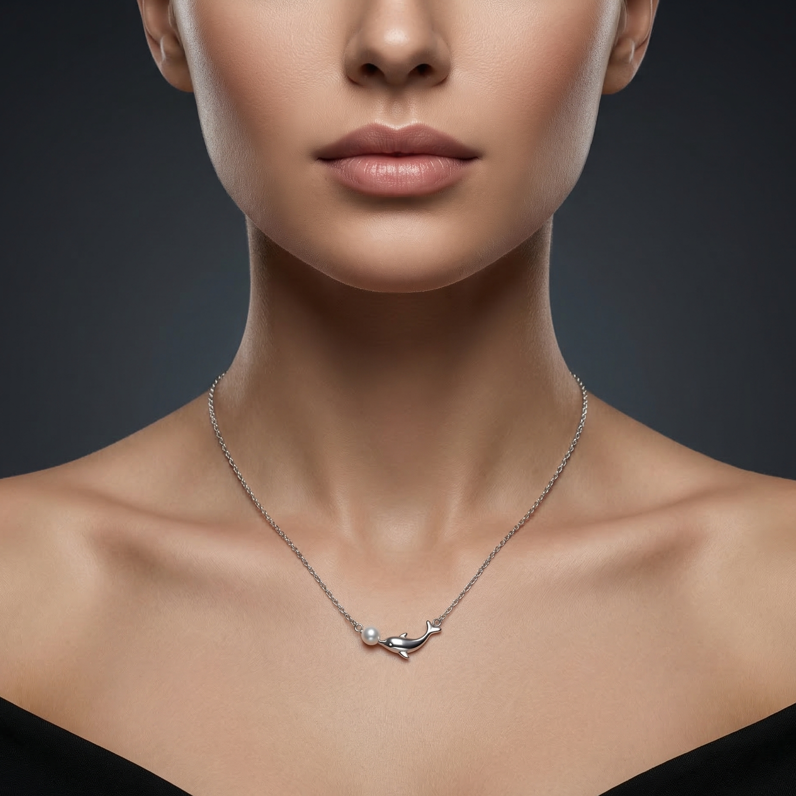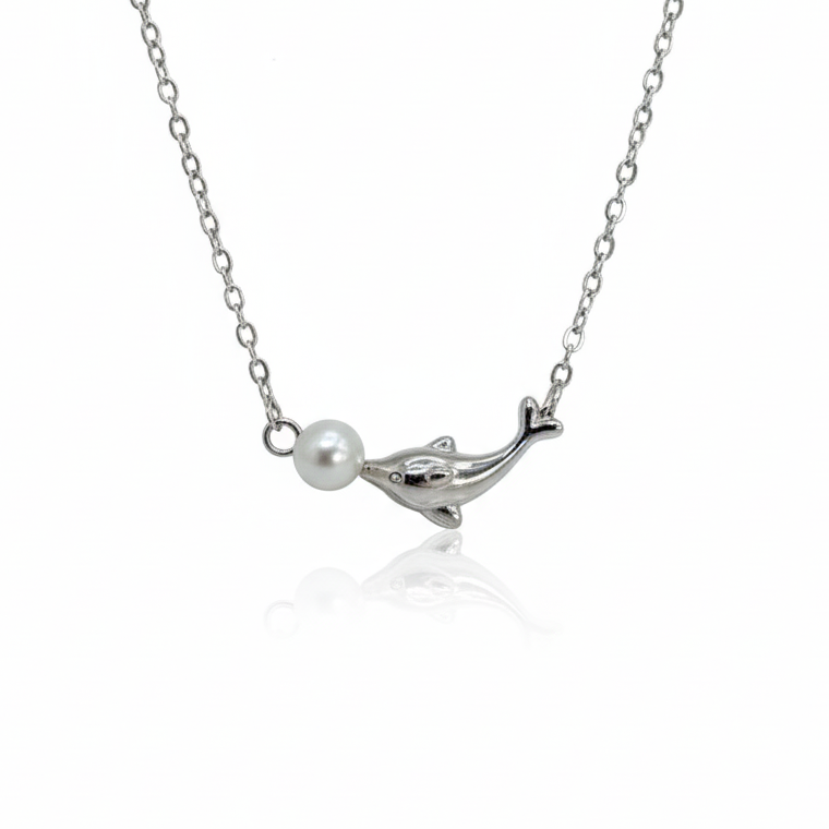 Dive into elegance with our Dolphin & Pearl Necklace, a graceful addition to your jewelry collection. This piece features a beautifully detailed dolphin leaping toward a shimmering, high-luster pearl, symbolizing playfulness, protection, and wisdom.