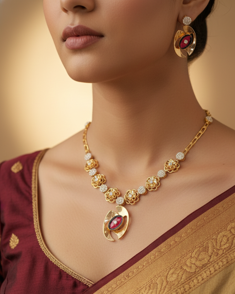 The Focal Point: A unique, sculpted oval pendant houses a deep crimson stone, centered with a single sparkling crystal for a “halo” effect.